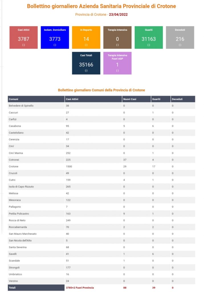 Crotone – L’ASP ha comunicato nella giornata del 23 aprile i dati relativi ai contagi distribuiti nel territorio della città di Crotone e nei Comuni della Provincia.