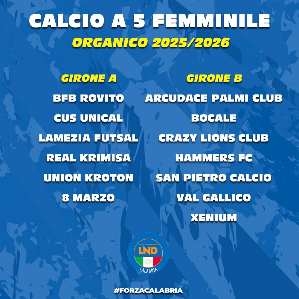 Il C.R. Calabria ha ufficializzato organico e gironi del campionato Femminile di Calcio a 5 con il Comunicato Ufficiale numero 83.