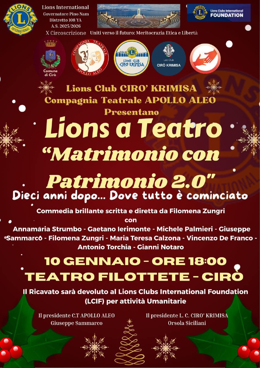 Cirò - Il Lions Club Cirò Krimisa annuncia una nuova iniziativa benefica: sabato 10 gennaio, alle ore 18, il Teatro Filottete di Cirò ospiterà la compagnia “Apollo Aleo” con la commedia brillante Matrimonio con patrimonio. L’evento segna un ritorno simbolico nel luogo in cui, dieci anni fa, prese avvio la prima raccolta fondi del club.