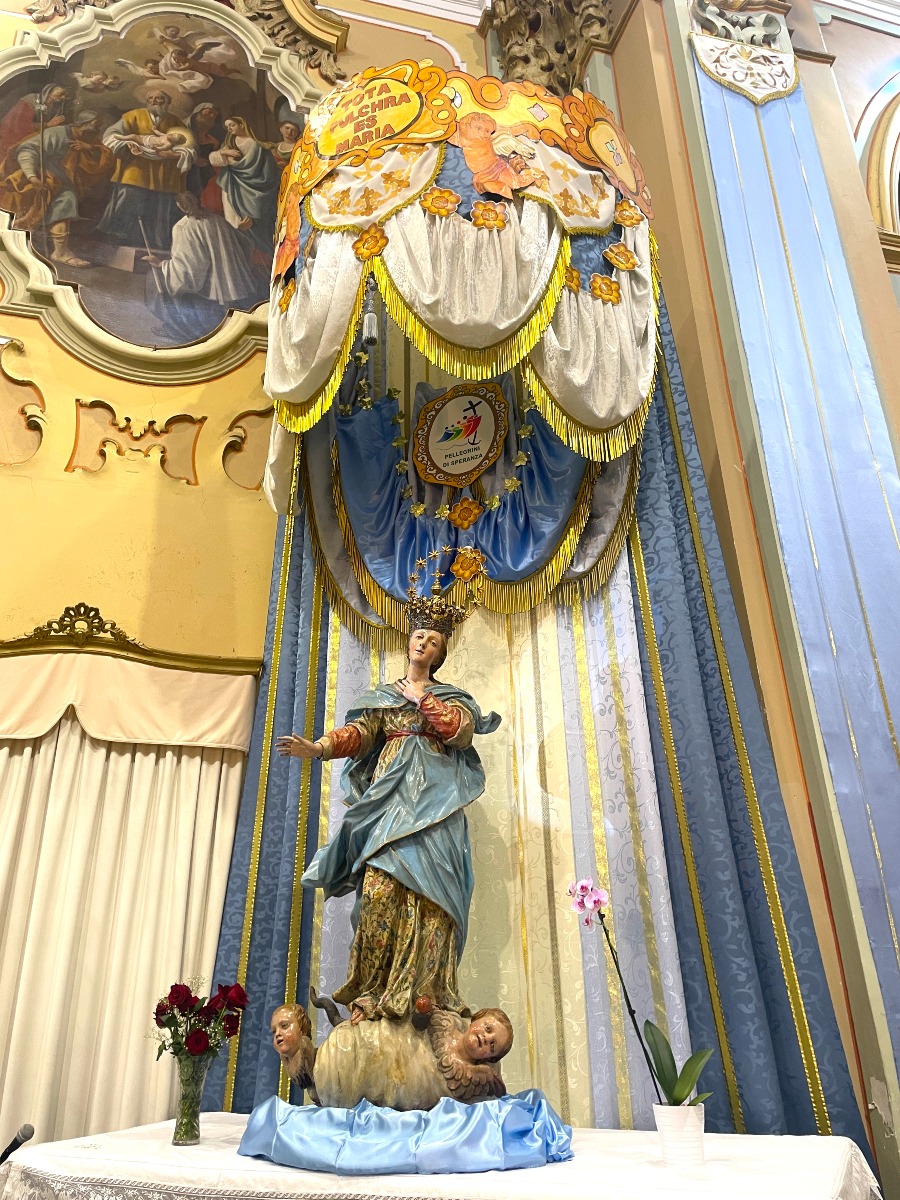 Nella chiesa dell’Immacolata di Crotone, già vestita a festa per l’imminente solennità dell’Immacolata Concezione, la statua della Madonna Immacolata è stata adornata ai piedi dell’altare maggiore, a sinistra.