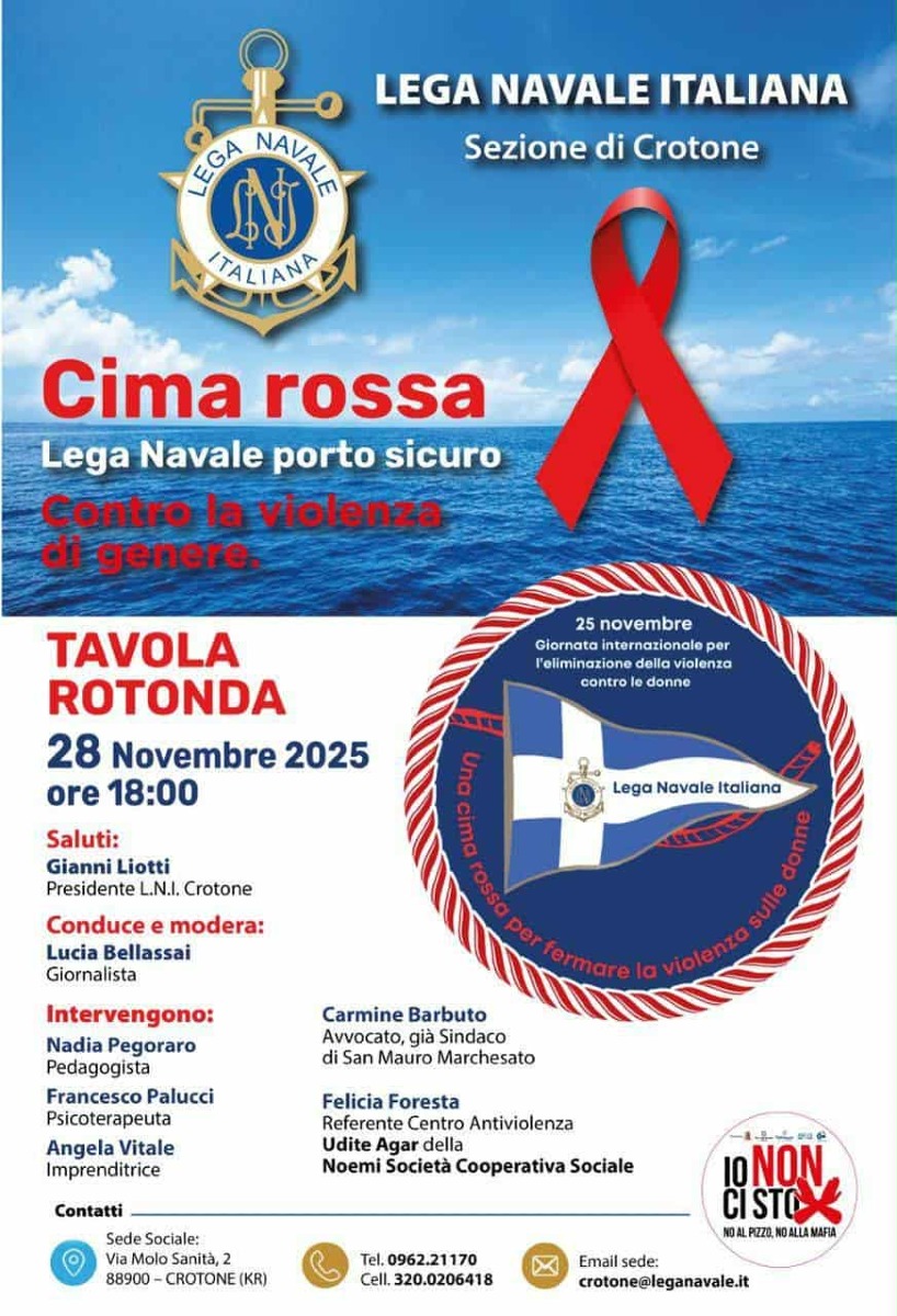 Crotone - Nella giornata di venerdì 28 novembre a partire dalle ore 18:00 presso la Lega Navale di Crotone si svolgerà l'incontro dal titolo "Cima Rossa - Lega Navale porto sicuro contro la violenza di genere".