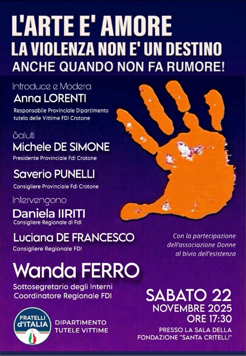 Crotone - L’arte è Amore. La violenza non è un destino, anche quando non fa rumore! È il messaggio che guida il convegno promosso a Crotone il 22 novembre 2025 alle ore 17:30, presso la Sala “Santa Critelli” di Via Botteghelle, dal coordinamento Provinciale FDI e dal Dipartimento Tutela delle Vittime.