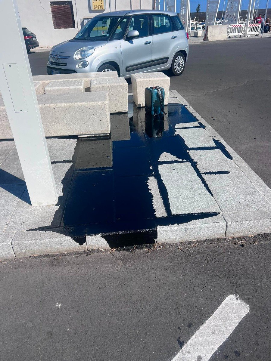 Da questa mattina una tanica metallica, apparentemente danneggiata, è rimasta incustodita sul pavimento del porto vecchio di Crotone, da cui si è riversato un liquido nero e denso che ha invaso il nuovo basolato dell’area. La segnalazione è arrivata da un cittadino, Benito Greco, che ha documentato la situazione con alcune foto, evidenziando come la chiazza si sia estesa fino al bordo della carreggiata.