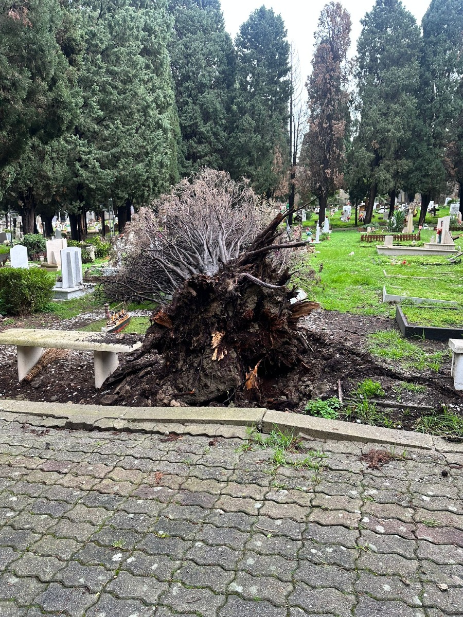 I rami, pesanti e carichi di pioggia, si sono abbattuti direttamente sopra numerose tombe e lapidi, coprendole completamente. Restano da valutare eventuali danni strutturali ai monumenti funebri sottostanti una volta rimosso il fusto.