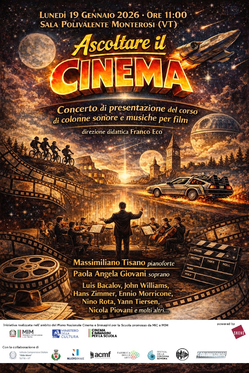 Il progetto, diretto scientificamente da Eco e sostenuto dai Ministeri della Cultura e dell’Istruzione e del Merito nell’ambito del Piano nazionale cinema e immagini per la scuola, sarà presentato lunedì 19 gennaio, alle ore 11, presso la sala polivalente di Monterosi, alle porte di Viterbo, con un concerto inaugurale. In programma un viaggio nella storia della colonna sonora attraverso brani di Luis Bacalov, John Williams, Hans Zimmer, Ennio Morricone, Nino Rota, Yann Tiersen, Nicola Piovani e altri grandi autori, eseguiti dal pianista Massimiliano Tisano e dal soprano Paola Angela Giovani.