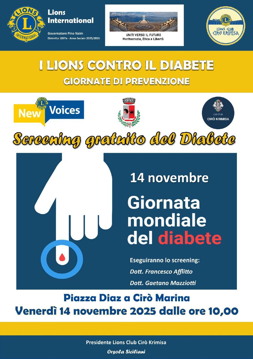 Cirò Marina - In occasione della Giornata Mondiale del Diabete, il Lions Club di Cirò Krimisa organizza una giornata di prevenzione gratuita per la diagnosi del diabete. L'evento si terrà venerdì 14 novembre 2025, a partire dalle ore 10:00, in Piazza Diaz a Cirò Marina.