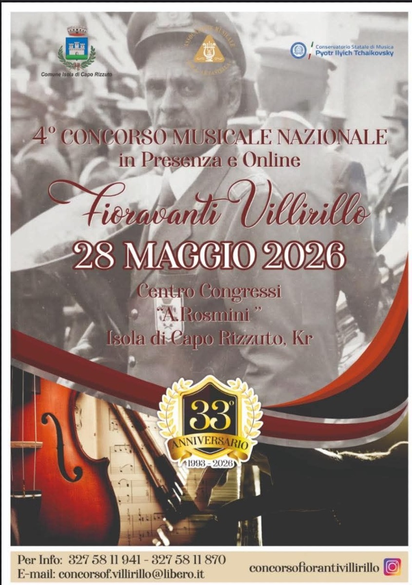 Isola di Capo Rizzuto - Con il patrocinio dell'amministrazione locale e la collaborazione del Conservatorio Statale di Musica P. I. Tchaikovsky di Nocera Terinese (CZ), è stata annunciata la quarta edizione del Concorso Musicale Nazionale "Fioravanti Villirillo".