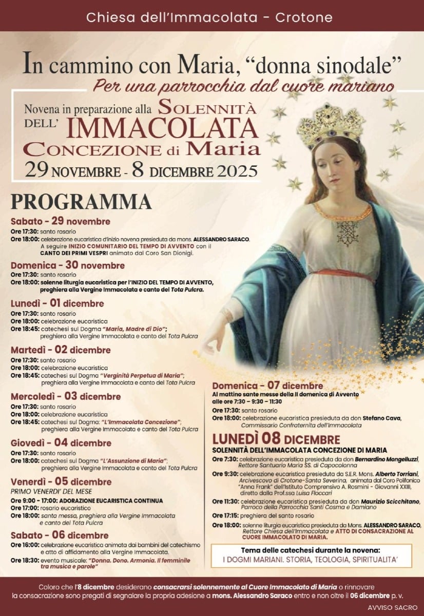 La Chiesa dell’Immacolata di Crotone si prepara a vivere la tradizionale novena in onore della Solennità dell’Immacolata Concezione, in programma dal 29 novembre all’8 dicembre 2025. Il tema scelto quest’anno, “In cammino con Maria, donna sinodale – Per una parrocchia dal cuore mariano”, invita i fedeli ad approfondire la dimensione comunitaria del cammino cristiano, accompagnati dalla figura materna della Vergine.