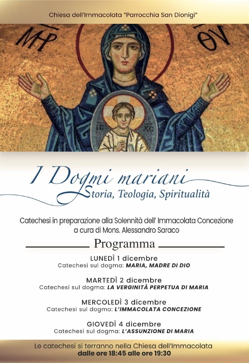 Parallelamente alla novena, la parrocchia propone un ciclo di catechesi specificamente dedicato ai quattro dogmi mariani, illustrati nel secondo allegato. Gli incontri, guidati da mons. Saraco nella Chiesa dell’Immacolata dalle 18.45 alle 19.30, rappresentano un’opportunità di approfondimento teologico e spirituale sulla figura di Maria. Il percorso segue un ordine: dalla maternità divina proclamata al Concilio di Efeso, alla verginità perpetua, fino al mistero dell’Immacolata e alla glorificazione piena dell’Assunzione. Un itinerario pensato per accompagnare i fedeli verso una comprensione più profonda delle verità che la Chiesa custodisce sulla Madre di Cristo.