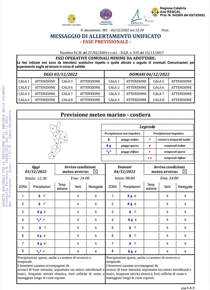 Maltempo – Sulla base dei fenomeni, la Protezione Civile Calabria ha emanato allerta gialla anche per oggi, domenica 4 dicembre 2022.