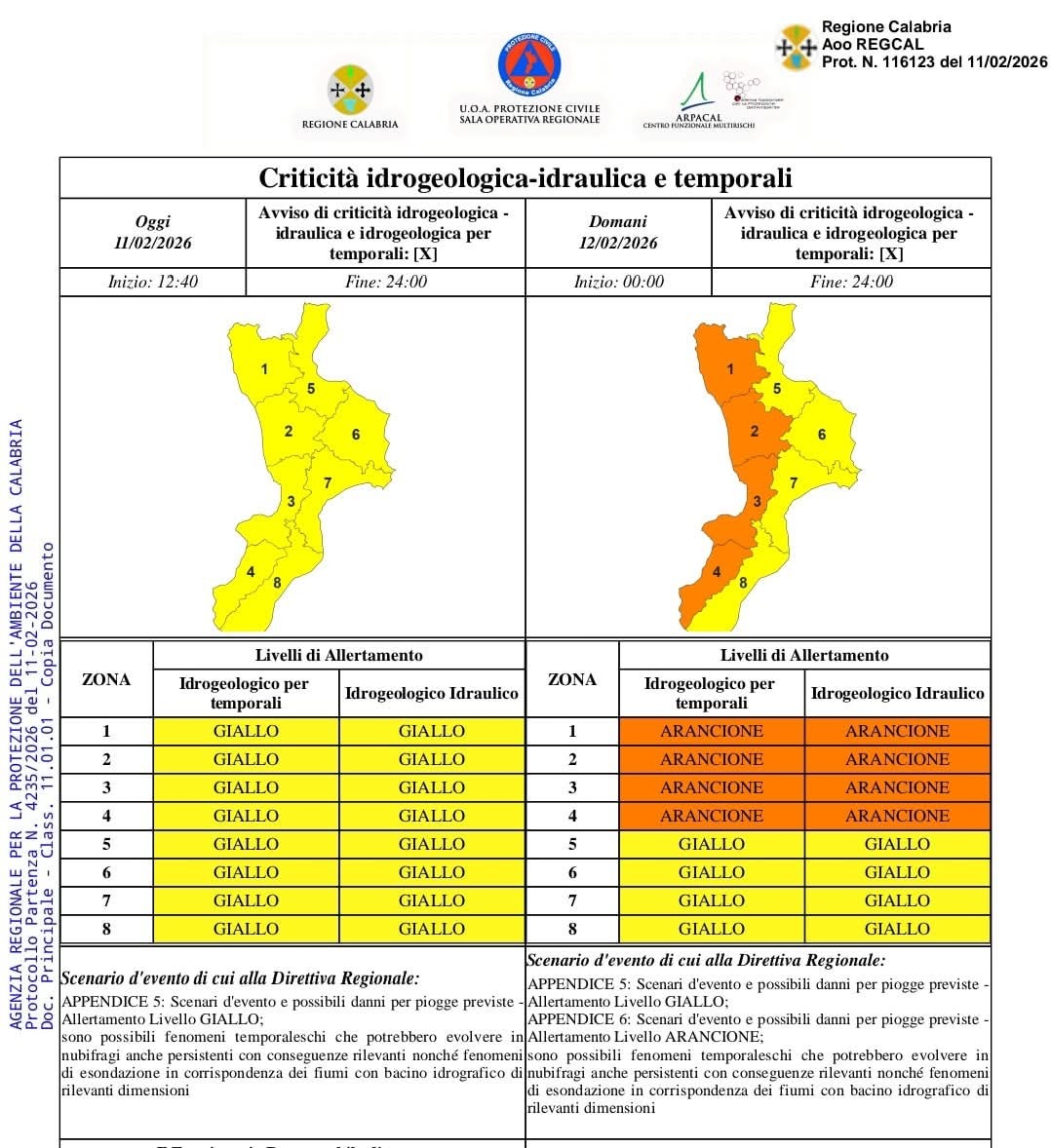 Dalle 00:00 alle 24:00 di domani, giovedì 12 febbraio 2026 è stato diramato un avviso di criticità idrogeologica e idraulica per temporali