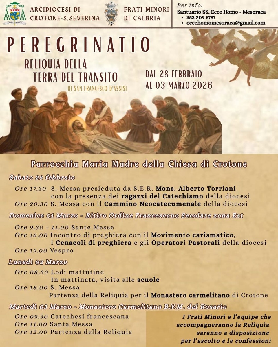 La città di Crotone si appresta a vivere un momento di profonda spiritualità e partecipazione comunitaria. Dal 28 febbraio al 3 marzo 2026, l’Arcidiocesi di Crotone-Santa Severina e i Frati Minori di Calabria promuovono la Peregrinatio della Reliquia della Terra del Transito di San Francesco d’Assisi. L’evento, che toccherà luoghi simbolo della fede cittadina, rappresenta un’occasione unica per i fedeli di accostarsi al carisma del Poverello d’Assisi attraverso un segno tangibile del suo passaggio terreno.