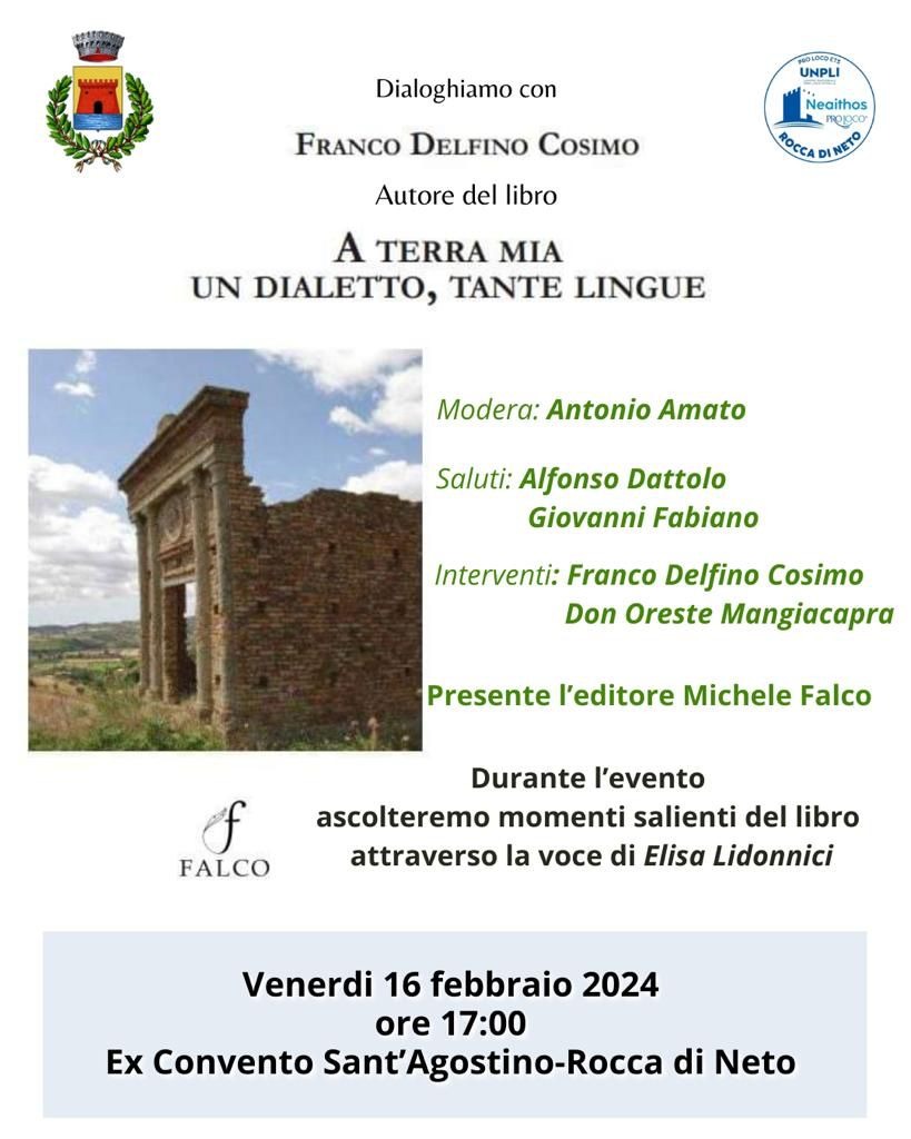Rocca di Neto - Venerdì 16 febbraio 2024, alle ore 17:00, l’ex convento Sant’Agostino di Rocca di Neto ospiterà la presentazione di un nuovo lavoro letterario di Franco Delfino Cosimo, intitolato A Terra Mia: un dialetto, tante lingue. Un’occasione imperdibile per immergersi nel labirinto delle parole, dove si intrecciano impegno sociale, cultura e tradizione.