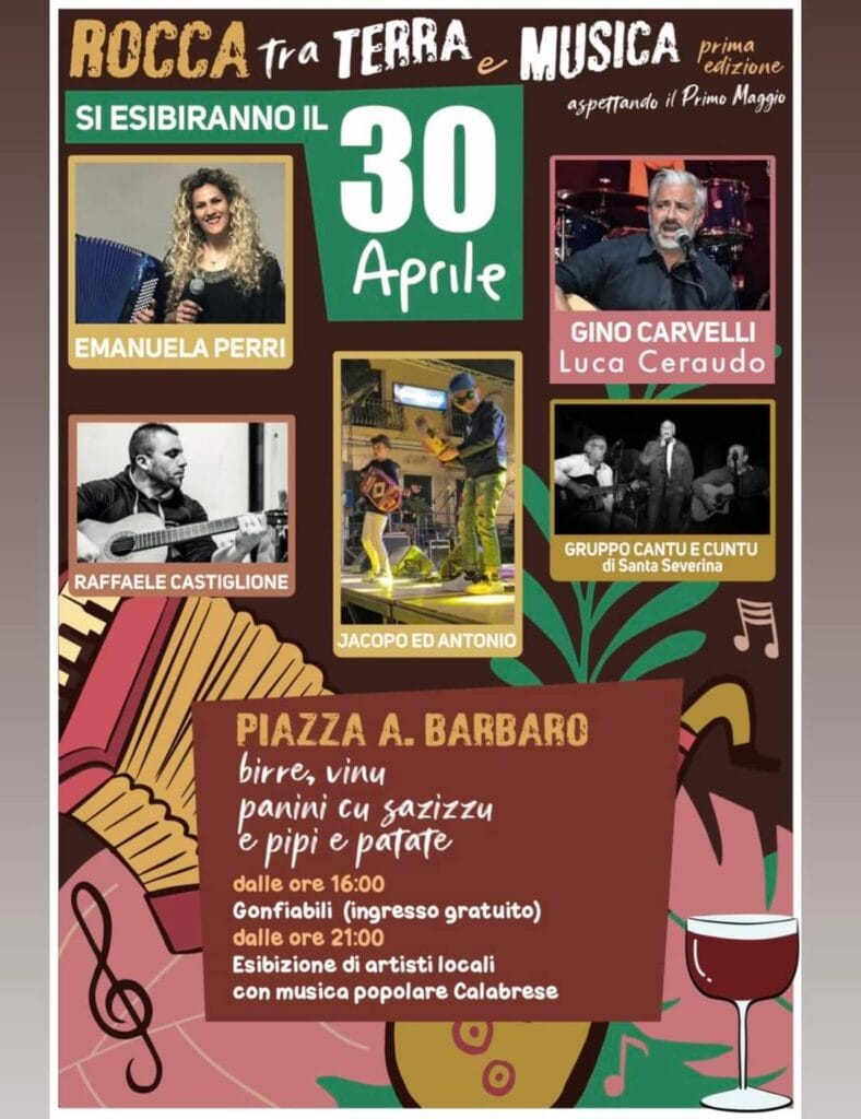 Roccabernada (KR) – Il 30 Aprile dalle ore 21:00 nell’evento Rocca tra Terra e Musica – aspettando il Primo Maggio, Piazza Aldo Barbaro ospiterà i seguenti artisti:
