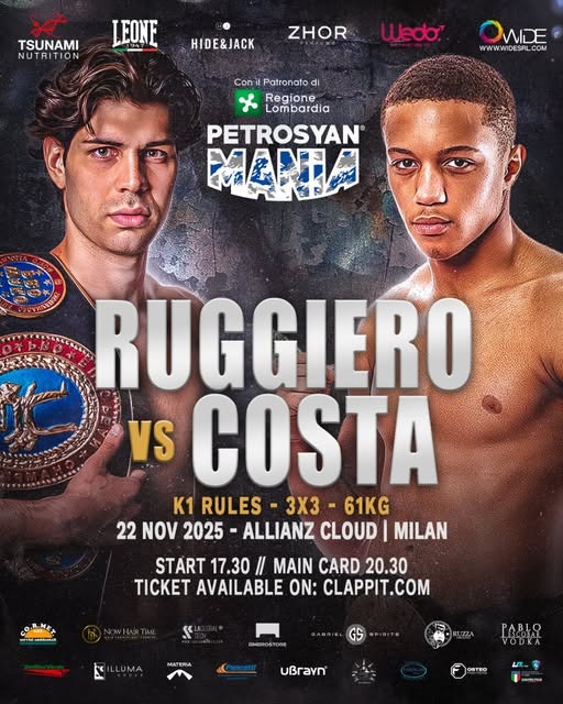 L’incontro, che si terrà sotto le regole del K1, categoria 61kg, si svolgerà al Allianz Cloud di Milano e sarà caratterizzato da tre round da 3 minuti ciascuno. Due fighter determinati, pronti a tutto per la vittoria: da un lato, il pugno e la tecnica di Ruggiereo, rappresentante del Team Tsunami Petrosyan, e dall’altro, la potenza e la resistenza di Costa, proveniente dal Ko Team.