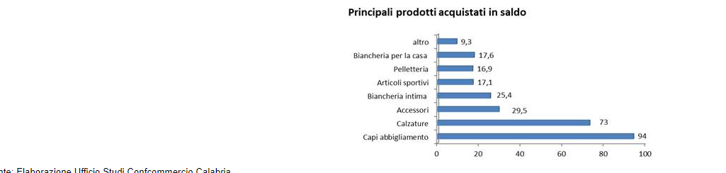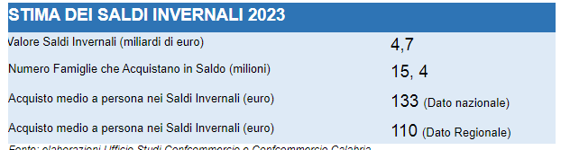 In termini di spesa l’Ufficio Studio di Confcommercio ha stimato che i cittadini calabresi spenderanno 110 € a testa negli acquisti in saldo in crescita del 10% rispetto allo scorso anno.