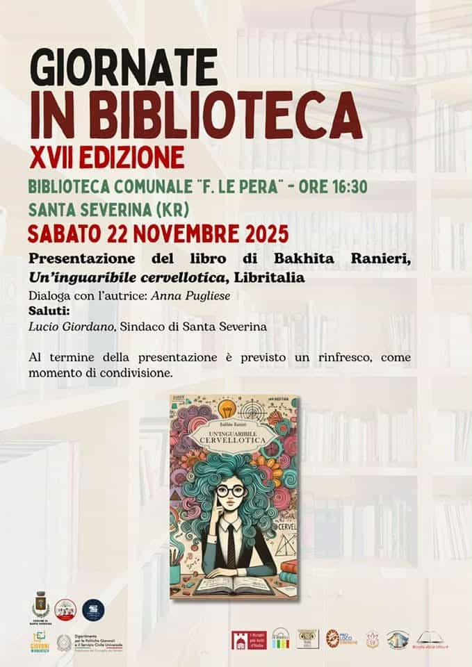 Santa Severina - Nella giornata di Sabato 22 novembre si svolgerà il secondo appuntamento delle Giornate in biblioteca il libro con Bakhita Ranieri “Una inguaribile cervellotica “ , che dialogherà con l’autrice Anna Pugliese.